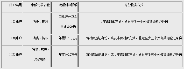 《办法》将个人支付账户分为三类(详见附表)。其中,Ⅰ类账户只需要一个外部渠道验证客户身份信息(例如联网核查居民身份证信息),账户余额可以用于消费和转账,主要适用于客户小额、临时支付,身份验证简单快捷。为兼顾便捷性和安全性,Ⅰ类账户的交易限额相对较低,但支付机构可以通过强化客户身份验证,将Ⅰ类账户升级为Ⅱ类或Ⅲ类账户,提高交易限额。