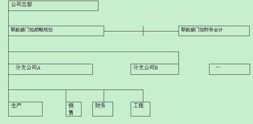 企业集团各成员企业在纵向合并的初期,一般都采用这种结构。但由于管理幅度过大而造成行政管理费用大于市场交易费、事无巨细的过分集中使企业无力顾及长期发展战略决策与控制、各职能部门为追求各自的目标而偏离总目标等问题出现后,企业集团将寻求新的组织架构。