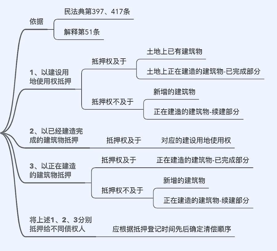 37 以建设用地使用权、已建造完成的建筑物、正在建造的建筑物设立抵押的,抵押权的效力范围如何确定?